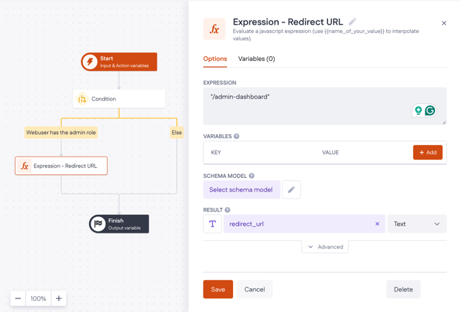4. Add an Expression step to reassign the redirect_url variable to the correct path (for each role if you have several of those).