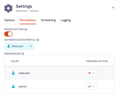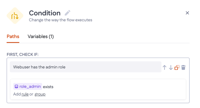 - Condition — check the user's role (e.g. "Webuser has admin role")