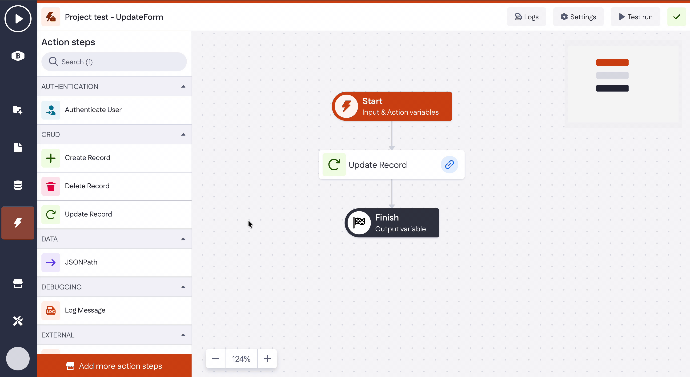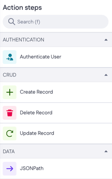 Each step can perform its function - a piece of logic that can be configured individually. For instance, the Create Record step creates and inserts records into the database. For more information on each step, read the Action step functionality article.