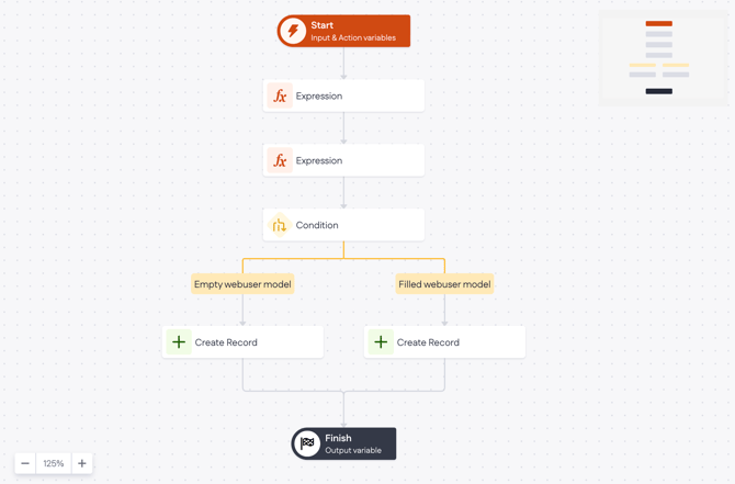After clicking the Edit button, you will be redirected to the action builder overview. As you can see, the action step Create Record has already been added between the Start and Finish steps. It has been automatically filled with the chosen model and its properties.
