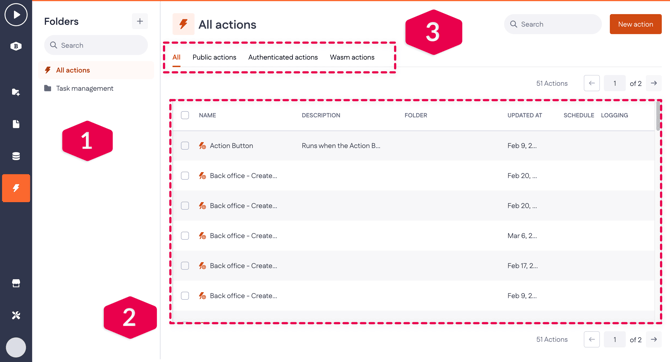 Folders in the left sidebar (1), which help you organize different types of actions by their purpose.