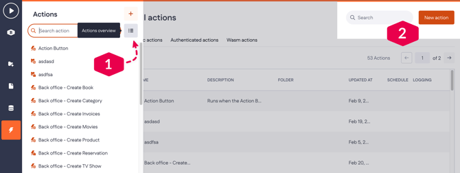 You can also create an action by going to the Actions overview (1) and clicking New action (2) in the top-right corner.