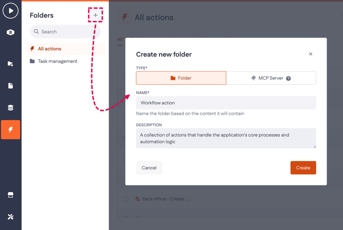Click the + button next to Folders in the Actions sidebar to create a new folder. Use folders to organize different types of actions (including Wasm actions) and to configure MCP servers.