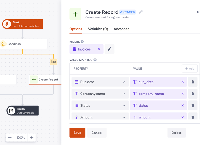 Click any step in the action flow to configure its options logic. For example, in Create Record step, you can choose the model, define value mappings, and add variables that are available within that step. When you’re done configuring, click Save button at the bottom.