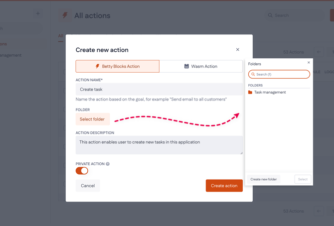A regular Betty Blocks action is a function that is created and used internally within your application. When creating a new action, provide an action name and description. Choose a singular, descriptive name that clearly reflects the action’s purpose. You can also organize the action by placing it in an existing folder or by creating a new one (click Select folder > Create new folder).