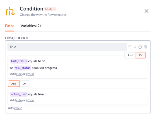After filling out the name, you can use Create filter rule button (1) to set up the rules for the first path (condition). Example: Variable 'status' equals 'Active'.. Read more about how filtering works here.