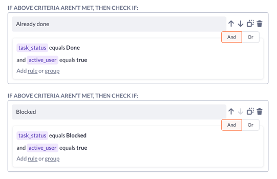 As an example, let’s add two more condition flows on top of the previous one because our tasks also have two more statuses: ‘Done’ and ‘Blocked’, and we want users to receive different outcomes as the result of these flows.