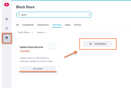 After preparations have been made, go to the block store and find the Update many records step in the Functions segment. Click on View details to open the block’s detail page and then press Install block.