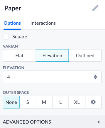Firstly, you can tick a square option form to change the outline of your component subtly. You can also choose the variant of this component: flat (1) will be the same as the Box component, while elevation (2) casts the shade onto the parent component; the outlined (3) version has an extra border to it.