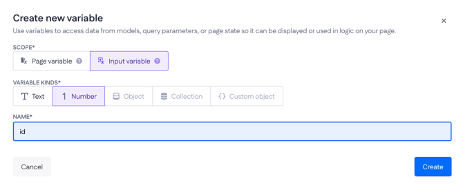 To add a new variable, click the + button. When creating a variable, you define its scope (page or input), select its kind (for example, Object or Number), and connect it to a model (if applicable). Once created, the resource becomes available for data binding in components and for use in page logic.
