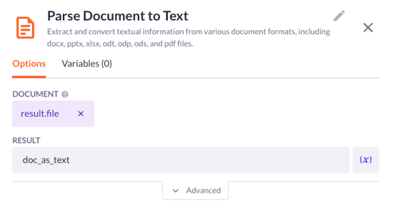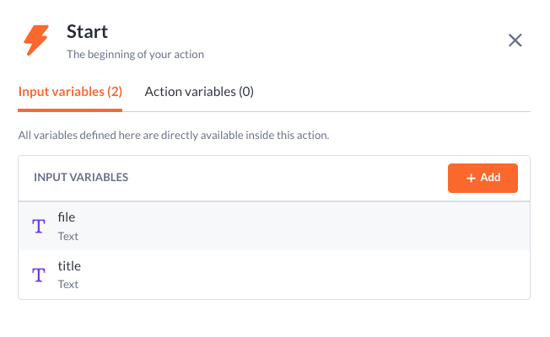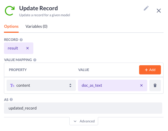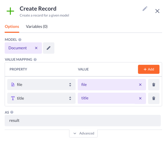 Select the Document model with the file and title properties and input variables from the previous step as their value.