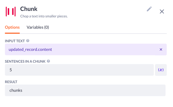 Chunk breaks down large pieces of text into smaller, more manageable chunks. For example, if you're building a plagiarism detection tool, you can use the chunk function to break down a document into smaller pieces and then compare each piece with a database of known works.