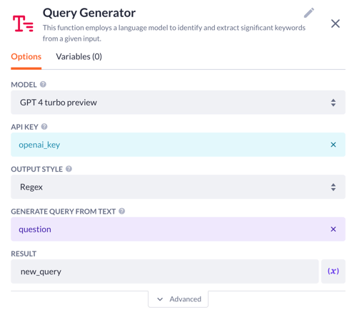 2. Then drop the query generator step. It will enable a language model to identify and extract the important keywords from a question (aka ‘query’). In the step options: