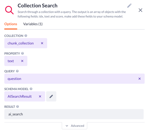 3. Next goes the Collection search. Here we will pick up the query and search through the chunk collection that we generated in a previous action.
