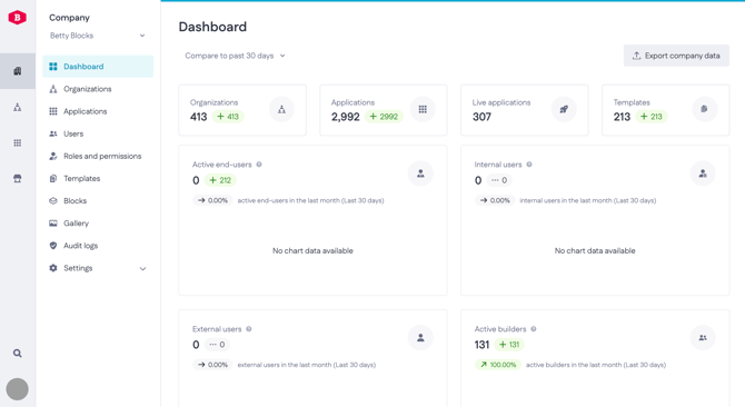 Access to My Betty Blocks for the entire organization, including builders, administrators, and owners. With company SSO, users authenticate once and can access My Betty Blocks and all application development environments they have builder rights for.