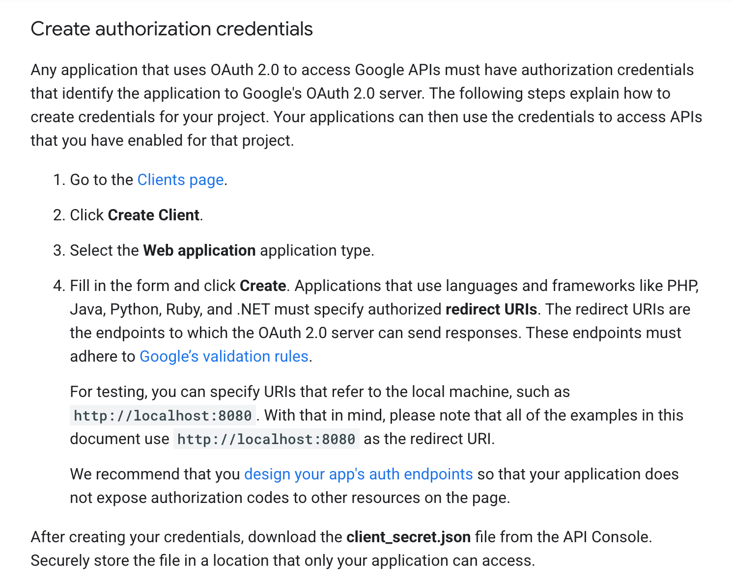 For example, here’s Using OAuth 2.0 for Web Server Applications in Google’s documentation. In the Create authorization credentials section, you will find some steps on how to get the credentials we need from Google: