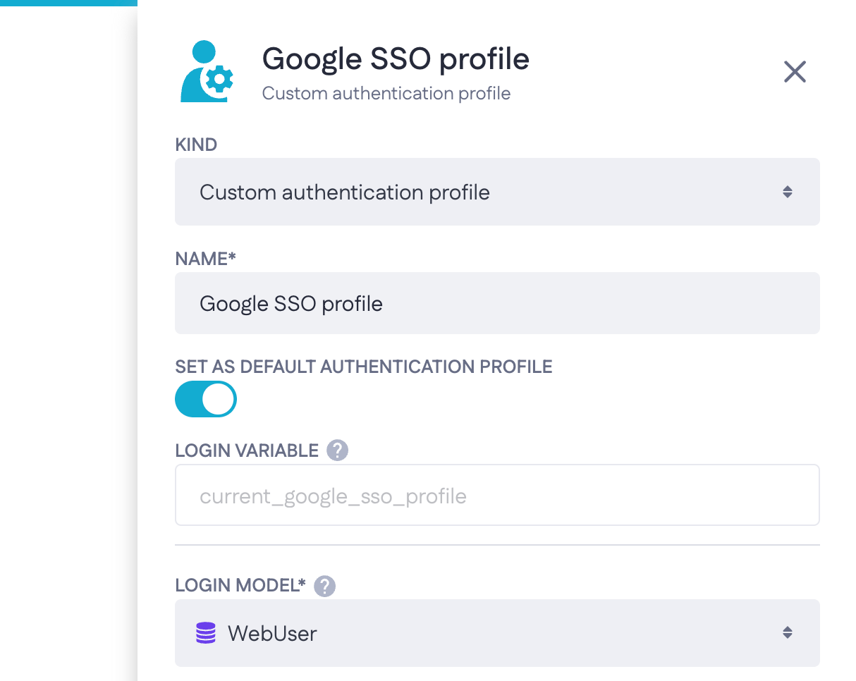 When configuring the login form, create a new authentication profile (e.g. ‘Google SSO profile’) and assign your user model - the one you’ve probably set up while using the login template