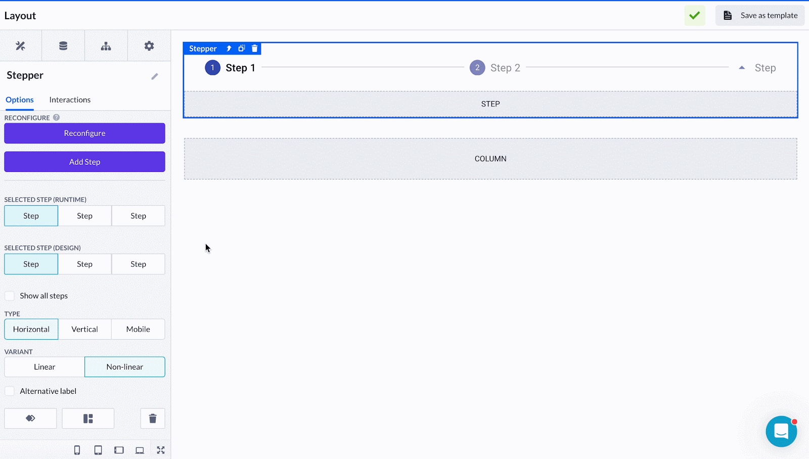 Reconfigure options allow you to add, delete, and change the order of Steps in the Step menu. While adding a new Step, you can also select an icon and its alignment in the menu.