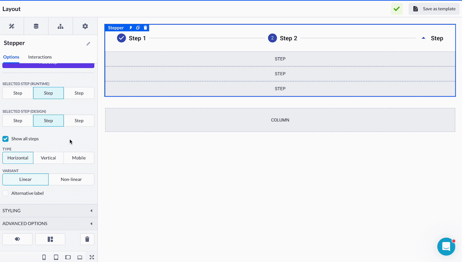 Selected step option enables you to choose the main tab to be displayed in both the runtime application (compiled page) and while designing in the Page builder. Tick the Show all steps option to show the content space for all existing Steps while designing in the Page builder, and also to mark every Step as active in the compiled (runtime) application.