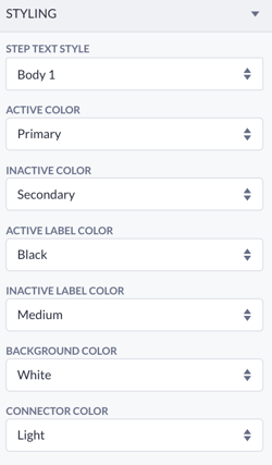 Styling enables you to customize the Stepper items and choose: step text style, active and inactive colors, active label color, etc.