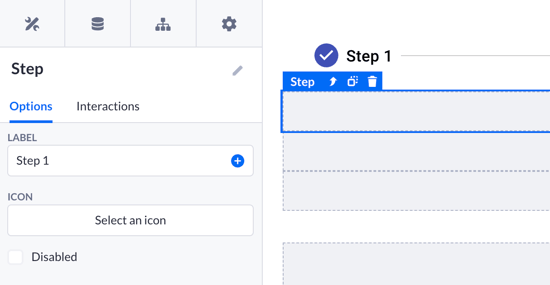 Single Step options include changing the label name (will be displayed while designing and in the runtime) and selecting an icon instead of the default (circled number). Each step can be also disabled separately.