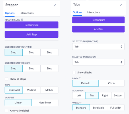 Both the Stepper and the Tabs have features in common. You can compare their primary options with the image below: