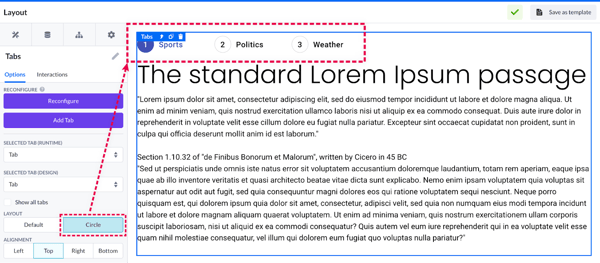 Within the Tab(s) components, the options include reconfiguring, step-selecting, layout, and styling.