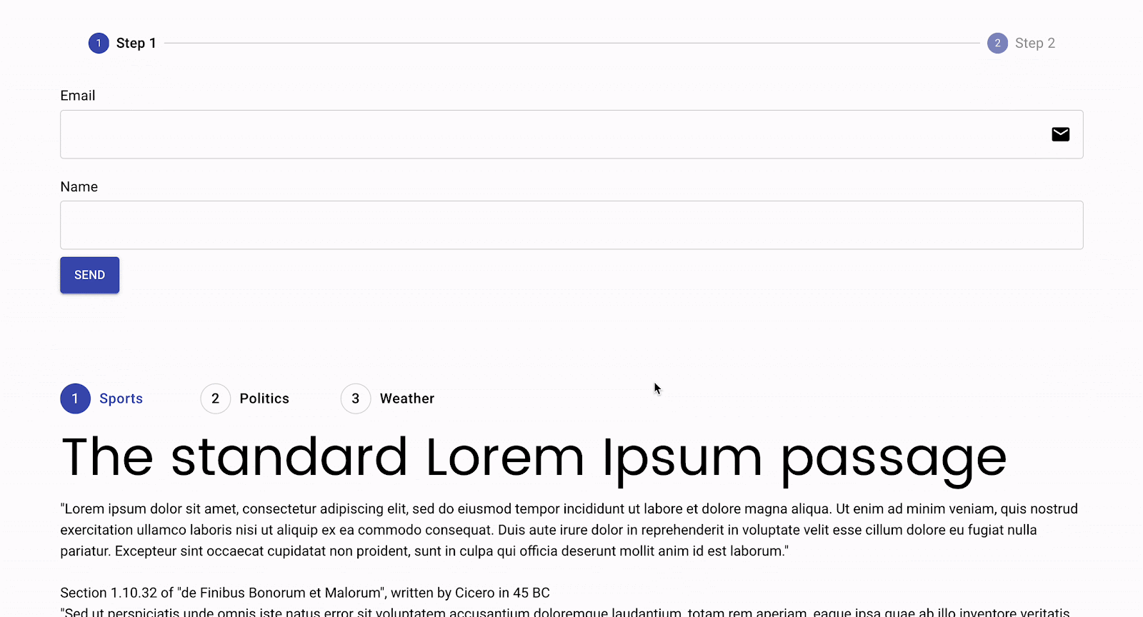 You can use both the Stepper and Tabs to enable users to switch between various pieces of content that you want to leave on the same page but somehow united by categories.
