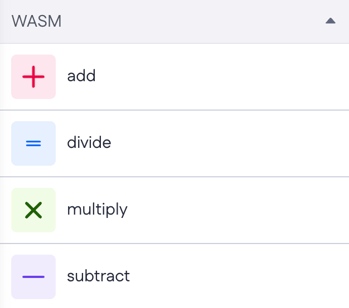 In the following Configure tab, you view all inner components of your Wasm custom step. Since our file aimed to calculate values, our components here are four operations - add, divide, multiply and subtract.